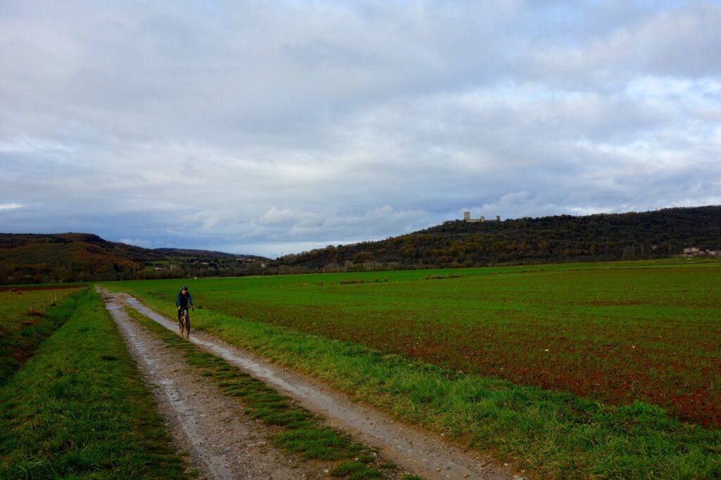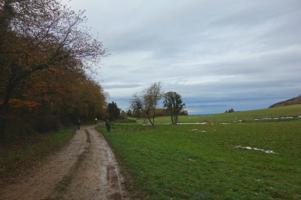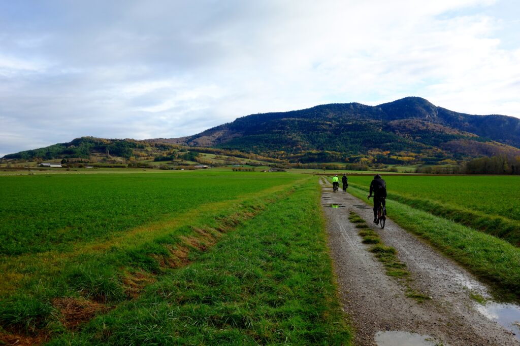 The five participants in the Special Ride left the lake and crossed a very pretty section towards Les Baylards to reach Sainte-Colombe-sur-L’Hers (this is the Hers-vif, which comes from Chioula, not the Hers-mort, which runs alongside Toulouse). There, a superb passage awaited us to reach Rivel via Monpenèdy and Les Bouichous, a pretty path then a track through the meadows and moorland, a little sticky but that’s normal for this time of year… We ended the day a little muddy… A little further on, we found snow, or what was left of it after the snowfall at the beginning of the week. Even though the clouds were low, we could see the mountains, especially around Saint-Barthélémy, where there was plenty of snow…