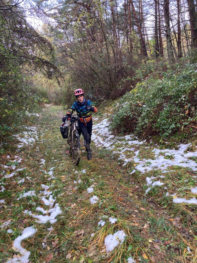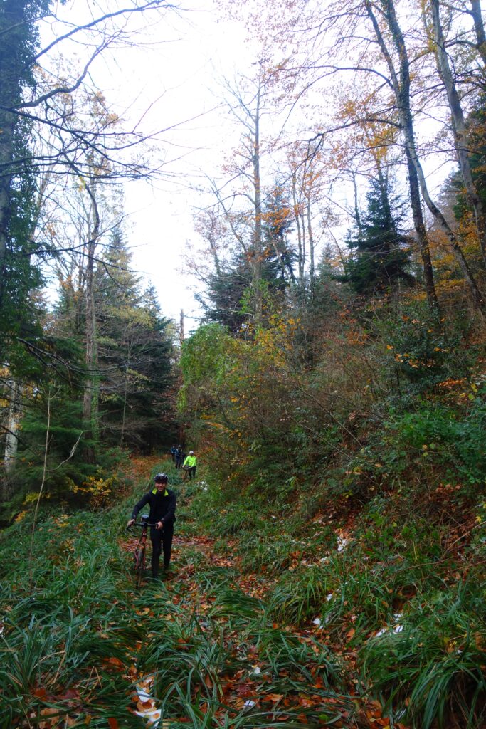 We left the road leading to Trou du Vent and the plateau to follow (it was Marcel who insisted! He was right to do so) a shady track that was a little bumpy but rideable, with some patches of snow remaining. A quick shout-out to my friends at the Rough Stuff Fellowship. I often write about this wonderful association, so feel free to check out their website, Facebook page or Instagram. I share their spirit in terms of cycling philosophy… This is a reference to one of my regular personal maxims: ‘Walking alongside it, carrying it, is also cycling!’
