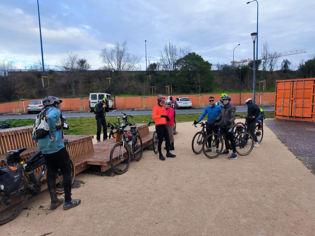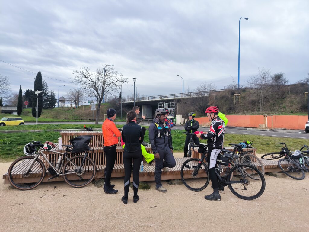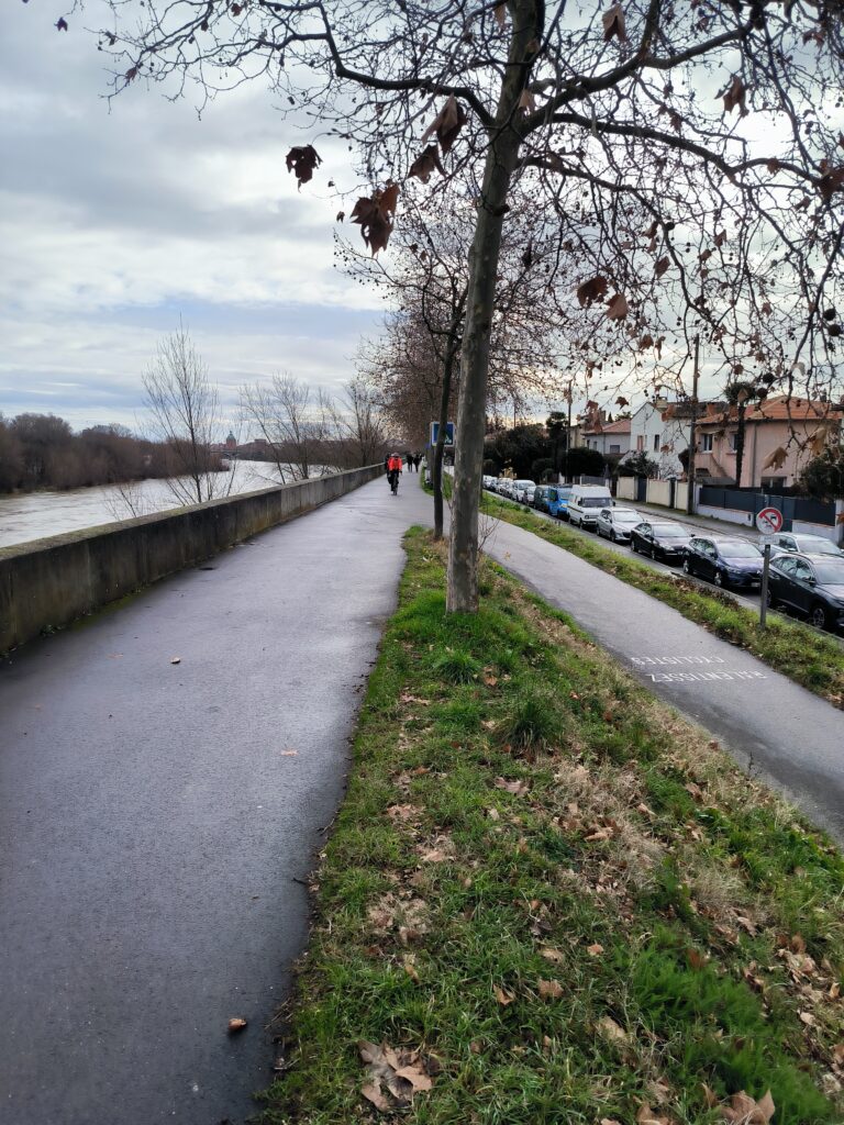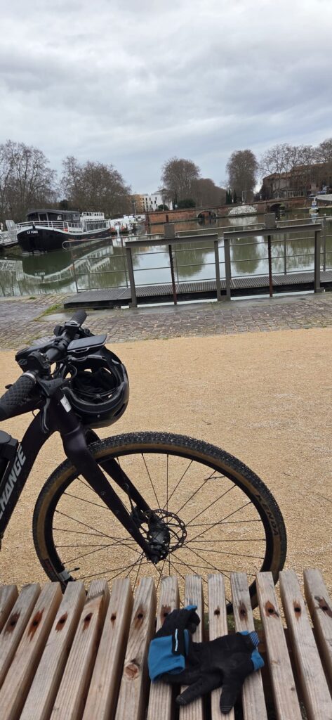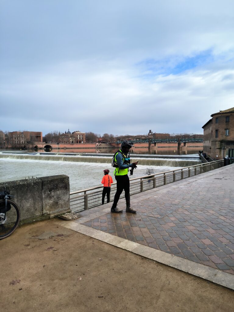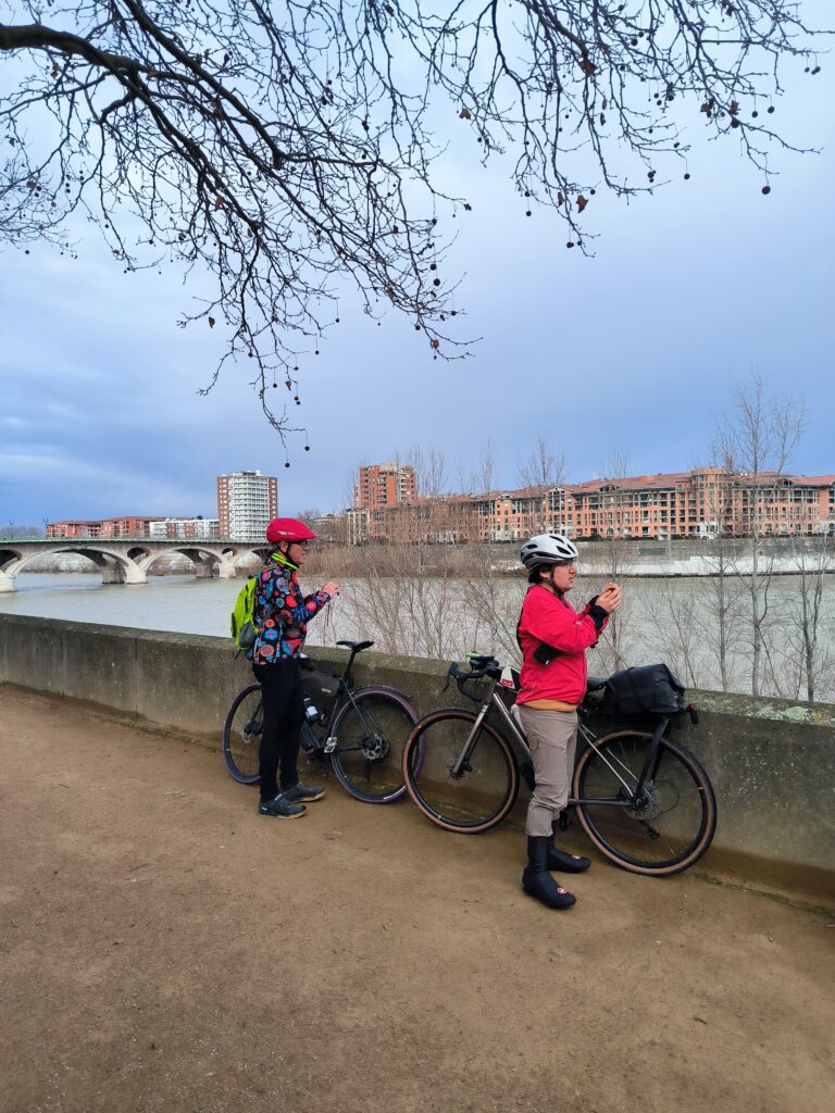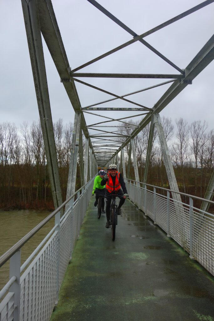 C’est en rejoignant une nouvelles fois les berges de la Garonne à la hauteur de Lache et de la base de loisirs des Quinze Sols que la véritable aventure commence. Floréal est le premier à nous faire un joli glissé harmonieux (à traduire par ‘prendre une bonne gamelle’ pour les non initiés), bientôt imité par Luxo, lui aussi en pneus lisses ou peu cramponnés. Heureusement, les deux se relèveront sans bobo, que ce soit du côté du pilote ou de sa machine ! D’autres à l’instar de Claire ou d’Emmanuel, font figure d’équilibristes et parviennent tant bien que mal à rester en selle en rattrapant de justesse quelques dérapages. On n’est plus très loin du cyclo-cross, par endroits mais tout le monde parvient finalement à rejoindre le Pont de Blagnac sans dommage. C’est là que certains choisissent de quitter le groupe pour rentrer chez eux tandis que les autres rejoignent le Pont de l’Embouchure par le quartier des Sept Deniers, Bourrassol, l’ultime traversée de la Garonne par le Pont St-Pierre et les Amidonniers.