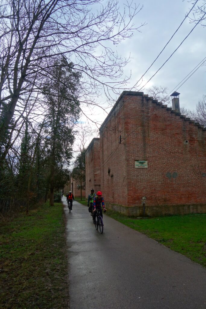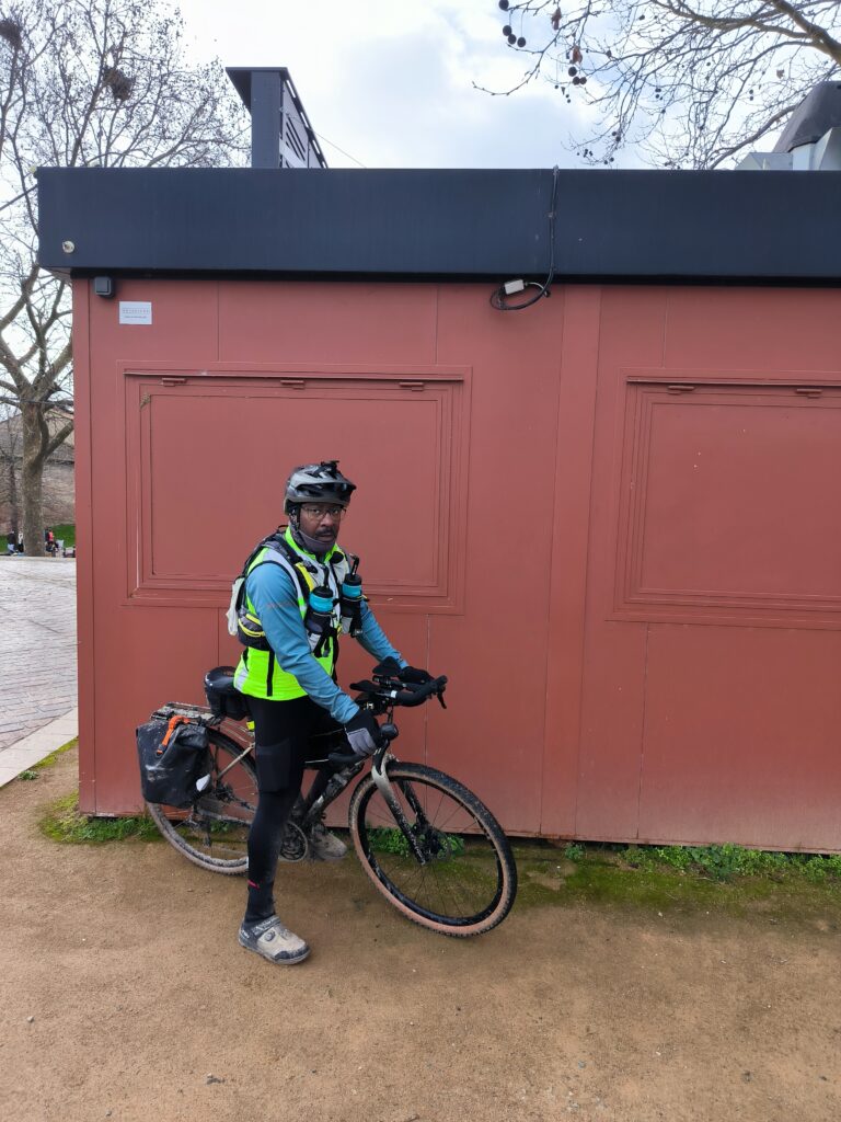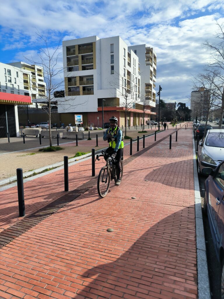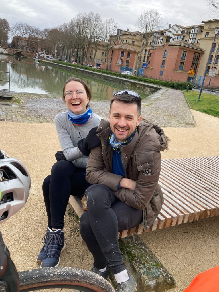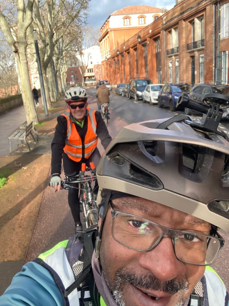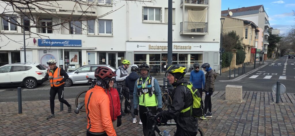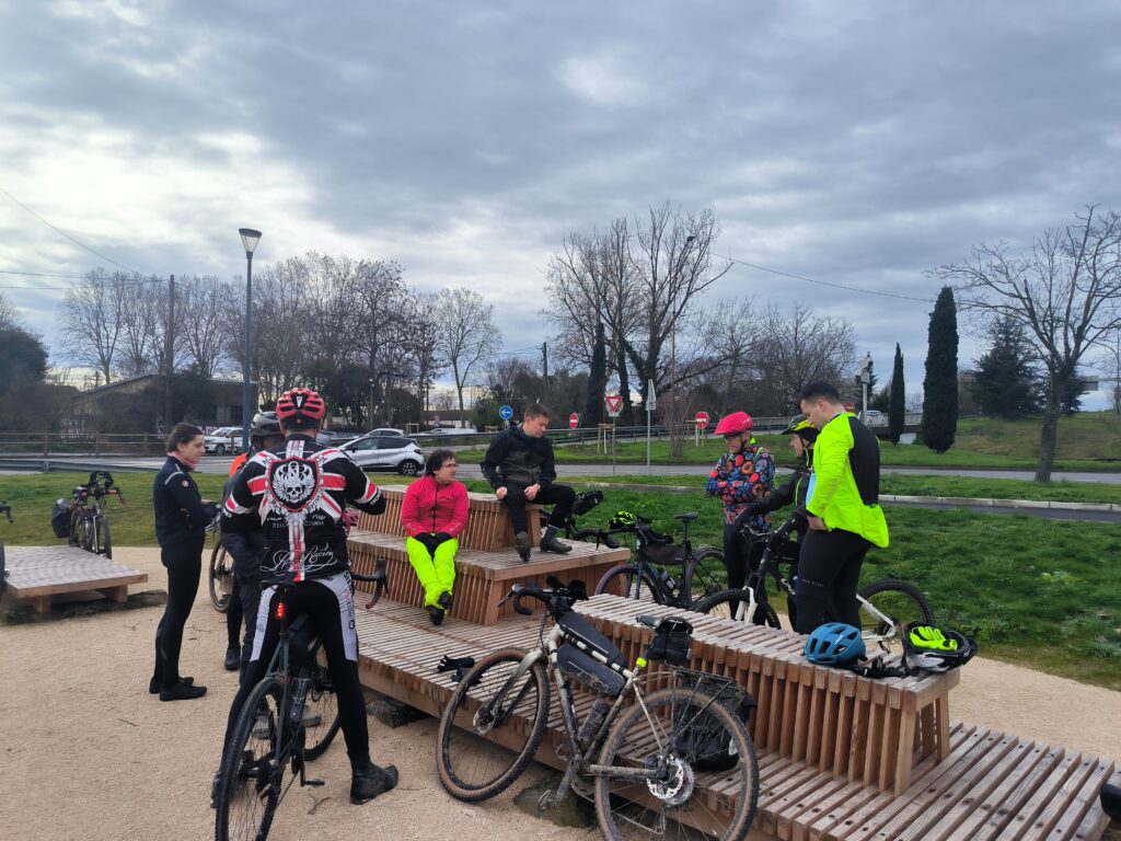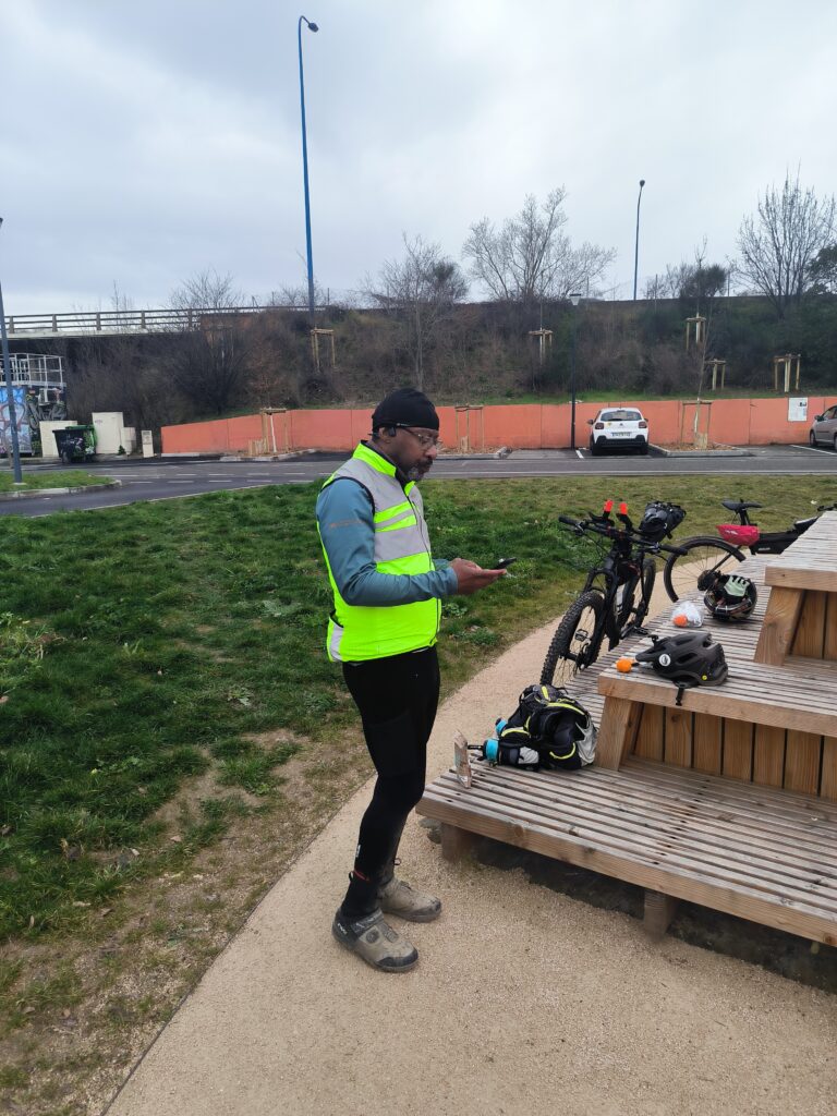 C’est en rejoignant une nouvelles fois les berges de la Garonne à la hauteur de Lache et de la base de loisirs des Quinze Sols que la véritable aventure commence. Floréal est le premier à nous faire un joli glissé harmonieux (à traduire par ‘prendre une bonne gamelle’ pour les non initiés), bientôt imité par Luxo, lui aussi en pneus lisses ou peu cramponnés. Heureusement, les deux se relèveront sans bobo, que ce soit du côté du pilote ou de sa machine ! D’autres à l’instar de Claire ou d’Emmanuel, font figure d’équilibristes et parviennent tant bien que mal à rester en selle en rattrapant de justesse quelques dérapages. On n’est plus très loin du cyclo-cross, par endroits mais tout le monde parvient finalement à rejoindre le Pont de Blagnac sans dommage. C’est là que certains choisissent de quitter le groupe pour rentrer chez eux tandis que les autres rejoignent le Pont de l’Embouchure par le quartier des Sept Deniers, Bourrassol, l’ultime traversée de la Garonne par le Pont St-Pierre et les Amidonniers.