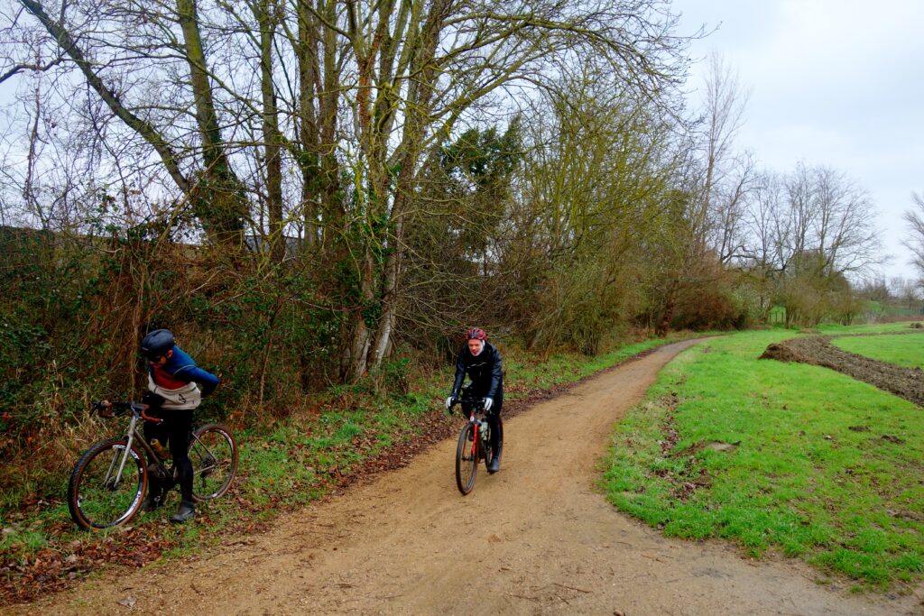 En tous cas, le risque de pluie n’a pas découragé Claire, Bastien et son amie, Emmanuel, Luc B., Jean-Marie, Bruno R., Jesse, Marcel, Enzo, Floréal, Gabriel, Thierry, Jack, Guillaume et Julie, sans oublier leurs deux enfants, Marius et Victoire qui, même s’ils sont encore bien trop petits pour pédaler, n’en ont pas moins de mérite d’avoir participé, transportés respectivement par leur papa et leur maman. D’ailleurs, à ma connaissance, Victoire doit être la plus jeune participante à une Family Ride de tous les temps, détrônant ainsi le petit Maxime âgé de moins de 4 ans, à la différence près que, bien que tracté de temps en temps par Youri, son papa, il pédalait avec vaillance. Oui, c’est aussi cela, l’esprit Ô Gravel : il y en a pour tous les âges et pour tous les goûts, ce qui n’empêche pas les adultes et les cyclistes confirmés à y prendre part, eux aussi et pour certains, de poursuivre avec la Special Ride. Quelques uns n’ont pas hésité à rajouter quelques dizaines de kilomètres supplémentaires en venant de plus ou moins loin à vélo et vu l’état de certaines montures, ils n’ont pas emprunté que des routes.