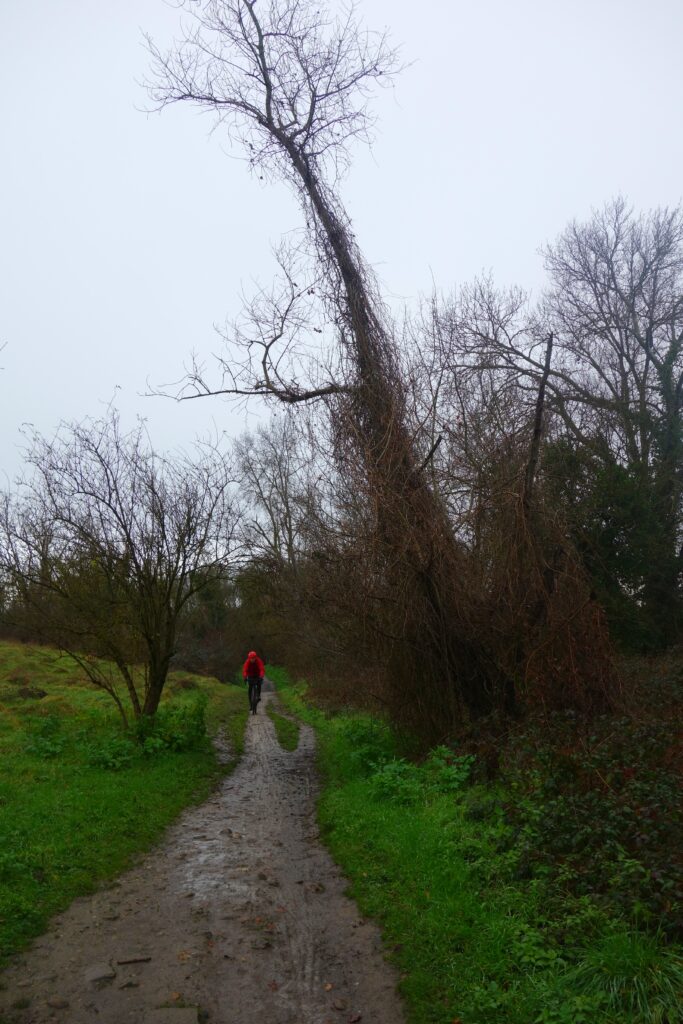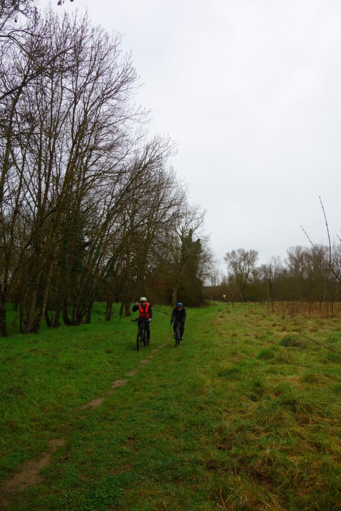 Aucun problème pour les cinq premiers kilomètres qui nous conduisent jusqu’au Lac de Sesquières par le Canal Latéral à la Garonne. Nous en faisons pratiquement le tour les berges de la Garonne et c’est là que les choses commencent à se compliquer sérieusement et que je me félicite d’avoir finalement opté pour mon VTT et ses gros pneus bien cramponnés plutôt que mon vélo de gravel. Le Chemin de Lombardi est gras à souhait à partir des Ramiers jusqu’à Gagnac-sur-Garonne mais le pire reste encore à venir. Nous traversons la Garonne à la hauteur des Millères et passons l’unique petite côte de la journée par le Bois de Bouscassié, puis nous contournons Seilh par l’Est pour rejoindre Beauzelle. Le passage à proximité de la zone industrielle de l’Aéroconstellation nous permet d’admirer quelques magnifiques appareils d’Airbus dont le fameux A380 aux dimensions hors normes ou encore le non moins impressionnant A400M Atlas.